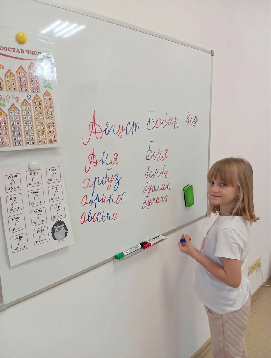 Занятия проходят индивидуально в моём оборудованном кабинете. Каждый урок длится 45 минут — это оптимальное время для дошкольника, чтобы не устать и усвоить материал. Мы чередуем разные виды деятельности: изучение нового, закрепление пройденного, развивающие игры.